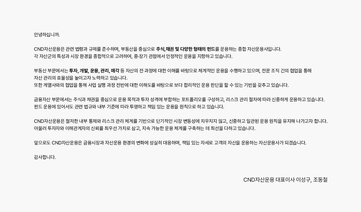 | 회사명 | 주식회사 씨앤디자산운용 [CND Asset Management Co., Ltd.] |